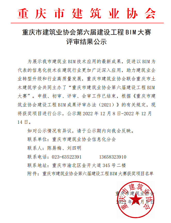 此次BIM大賽涵蓋BIM應用各階段,包含綜合和單項兩類BIM技術應用獎項,下設特等獎、一等獎、二等獎、三等獎、優秀獎等獎項。旨在展示重慶市建筑業BIM技術應用最新成果,促進以BIM為代表的信息化技術在建筑行業更加廣泛深入應用。本次獲獎,既是對同致誠的肯定,也是一種激勵,同致誠將繼續發揮自身優勢,積極推進信息化建設,分享推廣BIM技術在項目管理方面的成功經驗,創新發展BIM技術與工程項目各領域的深入融合,為業主提供更優質的服務,也為行業高質量發展貢獻更大力量。