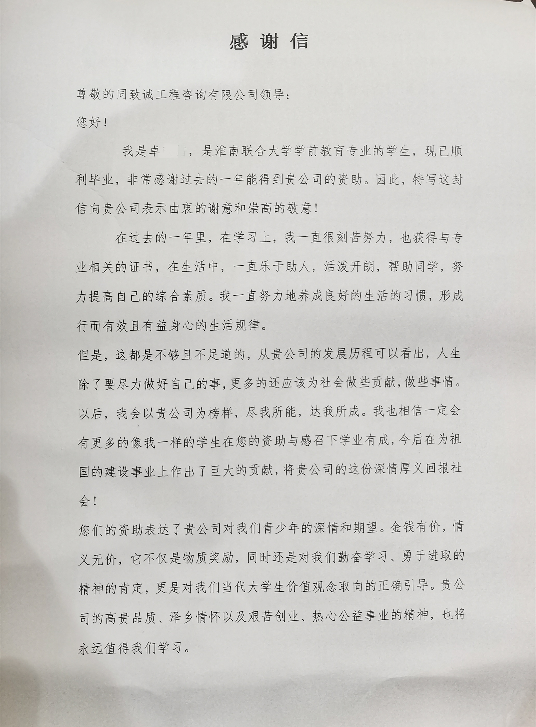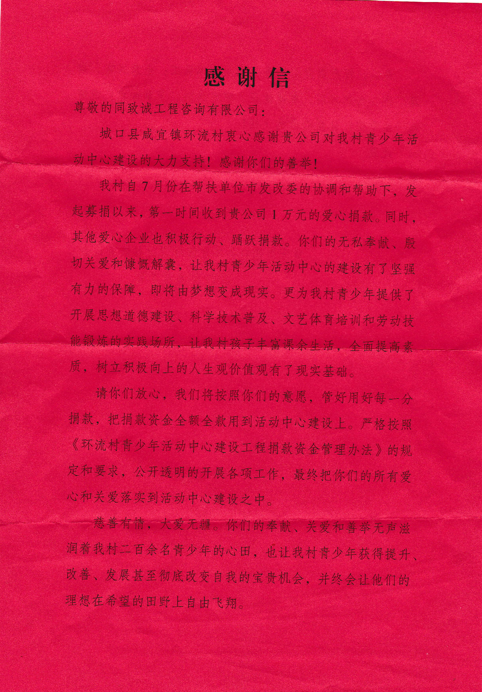近日,同致誠工程咨詢有限公司收到重慶市城口縣咸宜鎮環流村村民委員會及淮南聯合大學學前教育專業卓同學寄來的兩封感謝信。信中表達了對公司愛心捐款行為的感激之情和努力回報社會之意。