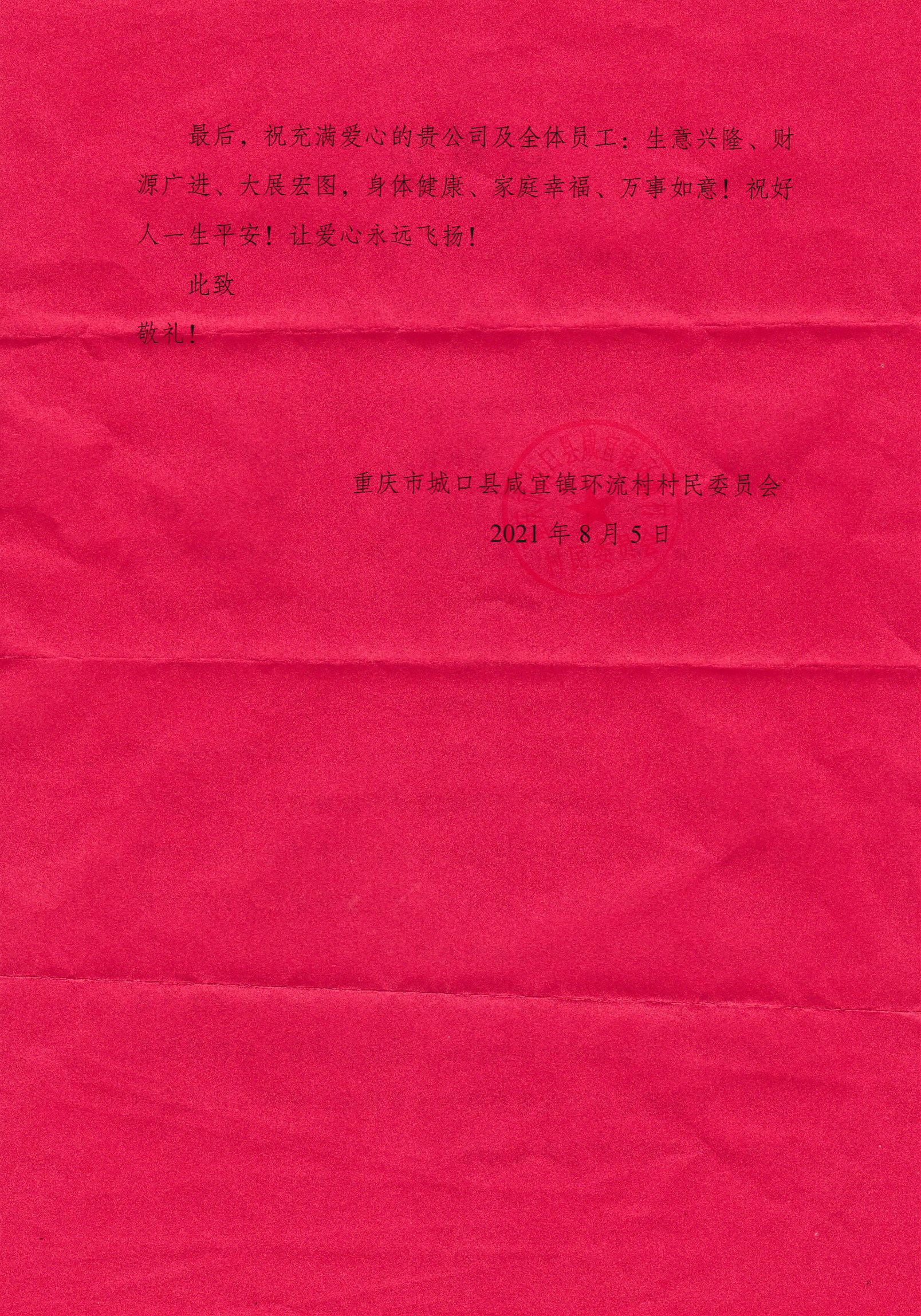 信中提及,城口縣咸宜鎮環流村為建設青少年活動中心在幫扶單位市發改委的協調和幫助下發起募捐。我司于第一時間獻出愛心,希望為孩子們的活動中心添磚加瓦。信中還表示,將管好用好每一分捐款,把捐款資金全額全款用到活動中心建設上,公開透明的開展各項工作。