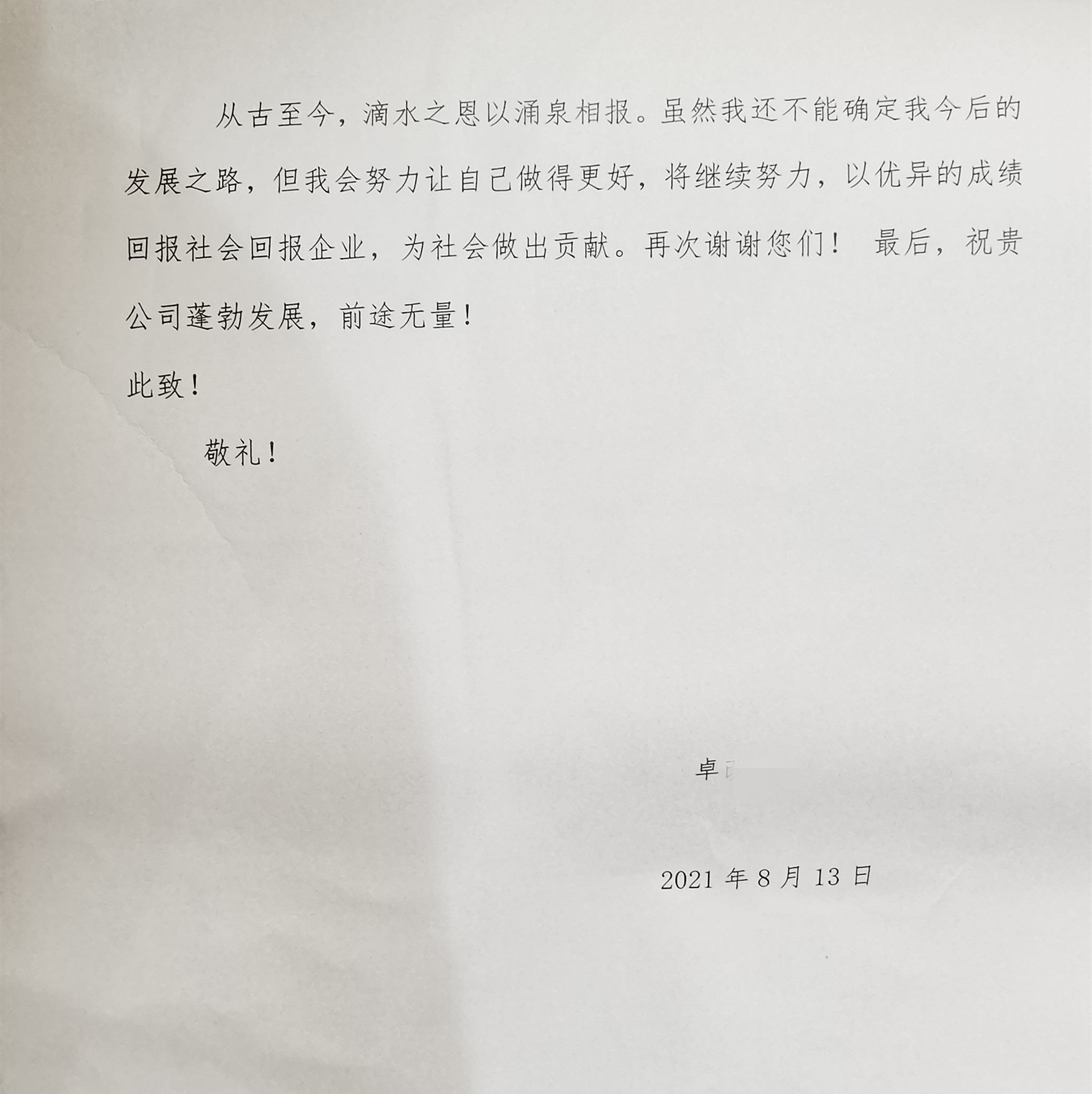 卓同學生活在青海,雖然家境貧苦,但學習上一直很刻苦,樂于助人,努力提高自己的綜合素質。為讓卓同學勿因學費問題影響到學習,公司資助該生直至畢業。