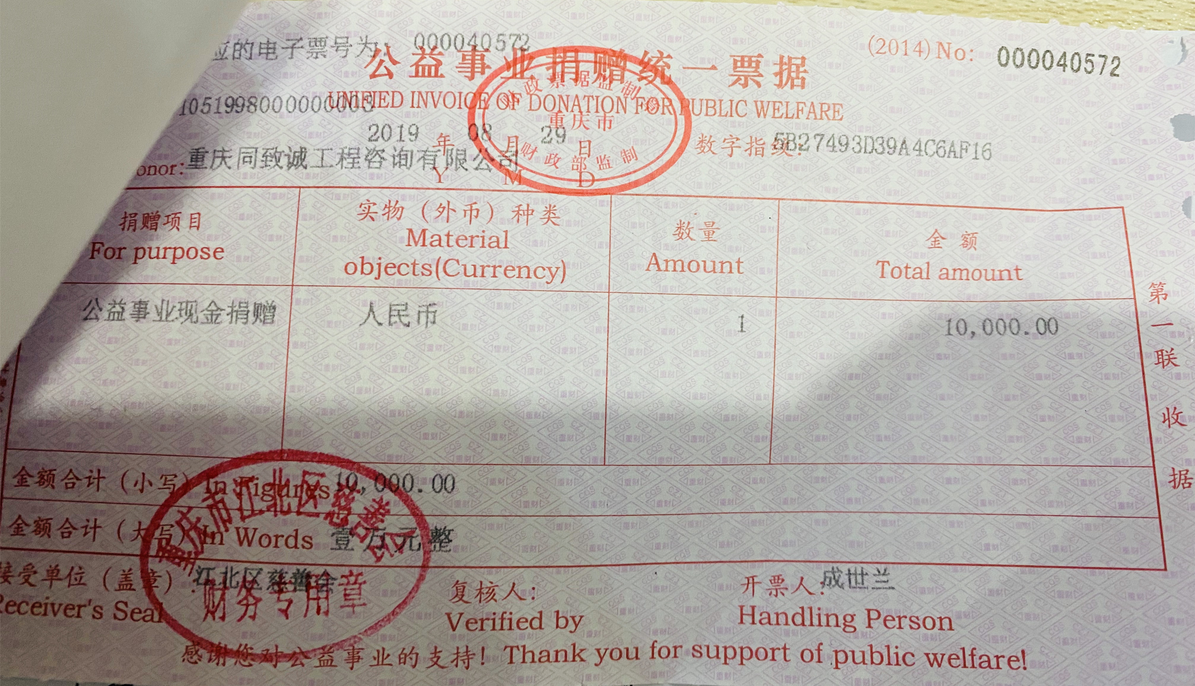 圖 | 為重慶市兒童愛心莊園愛心捐贈的票據