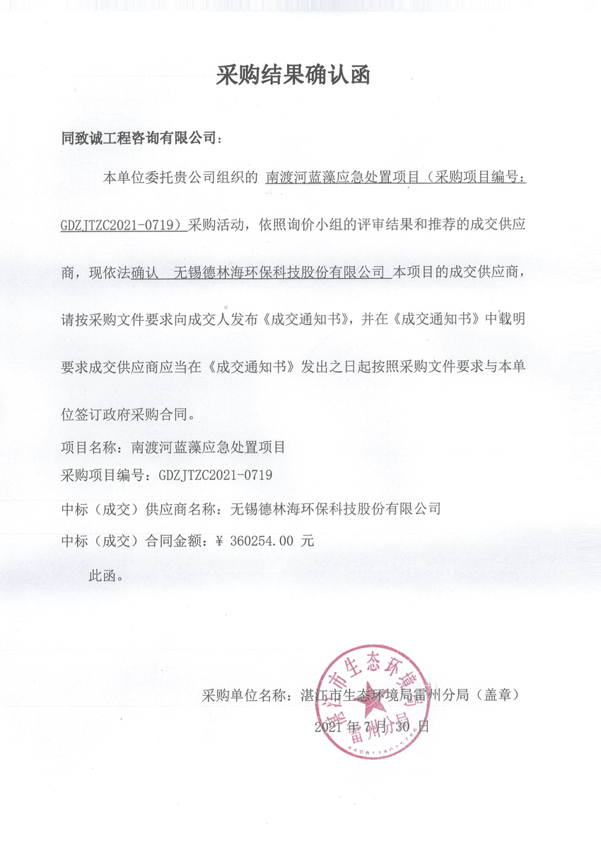 南渡河藍藻應急處置項目-采購結果確認函
