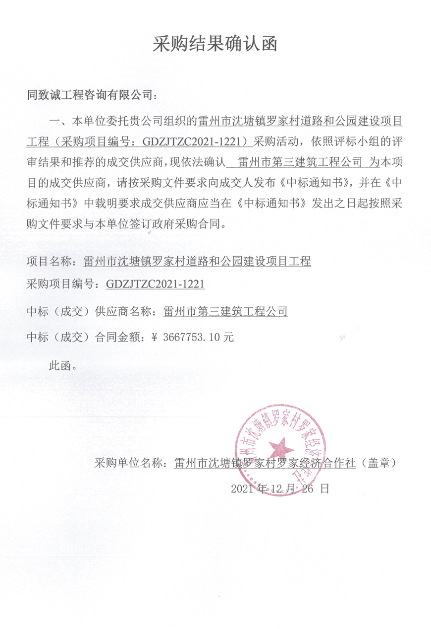 雷州市沈塘羅家村道路和公園建設項目工程確認函